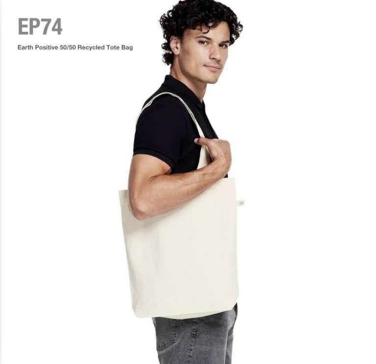 EP74 is the all new 50/50 Recycled bag. 50% GRS Recycled pre-consumer cotton organically grown and 50% OCS Organic Cotton. This tote bag is made in a plain weave from a lighter weight 170g fabric. It is available in 8 colours; black, white, natural (undyed), light beige (sand), French navy, blue dusk, light pistachio and ink grey.